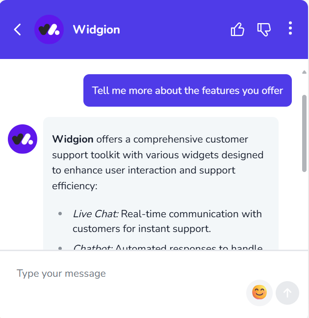 Sometimes, nothing beats a real conversation. Widgion’s Live Chat gives your team the ability to jump in and talk with customers in real time.
