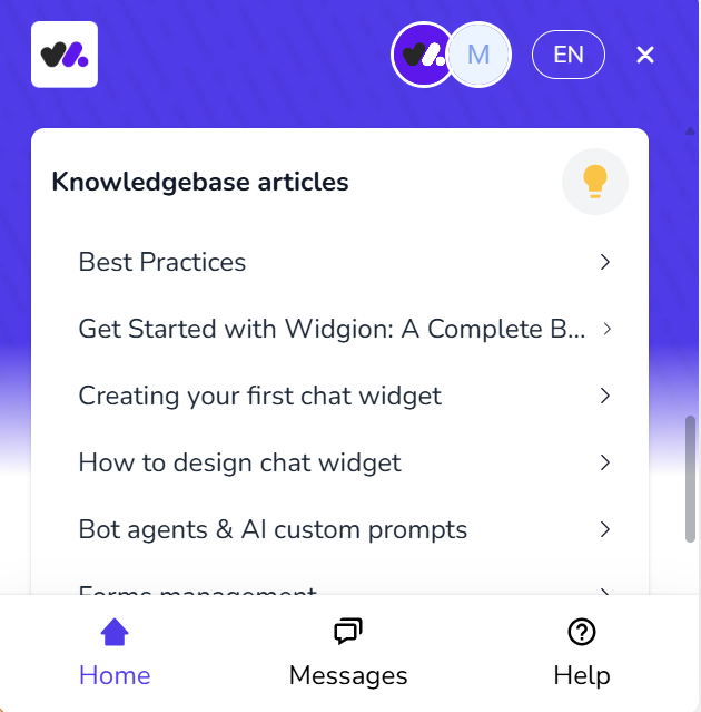 Sometimes people don’t want to chat at all they’d rather find the answer themselves. That’s exactly what the Help Hub is for. It’s like having a searchable library of guides, FAQs, and how-tos right inside Widgion Chat.